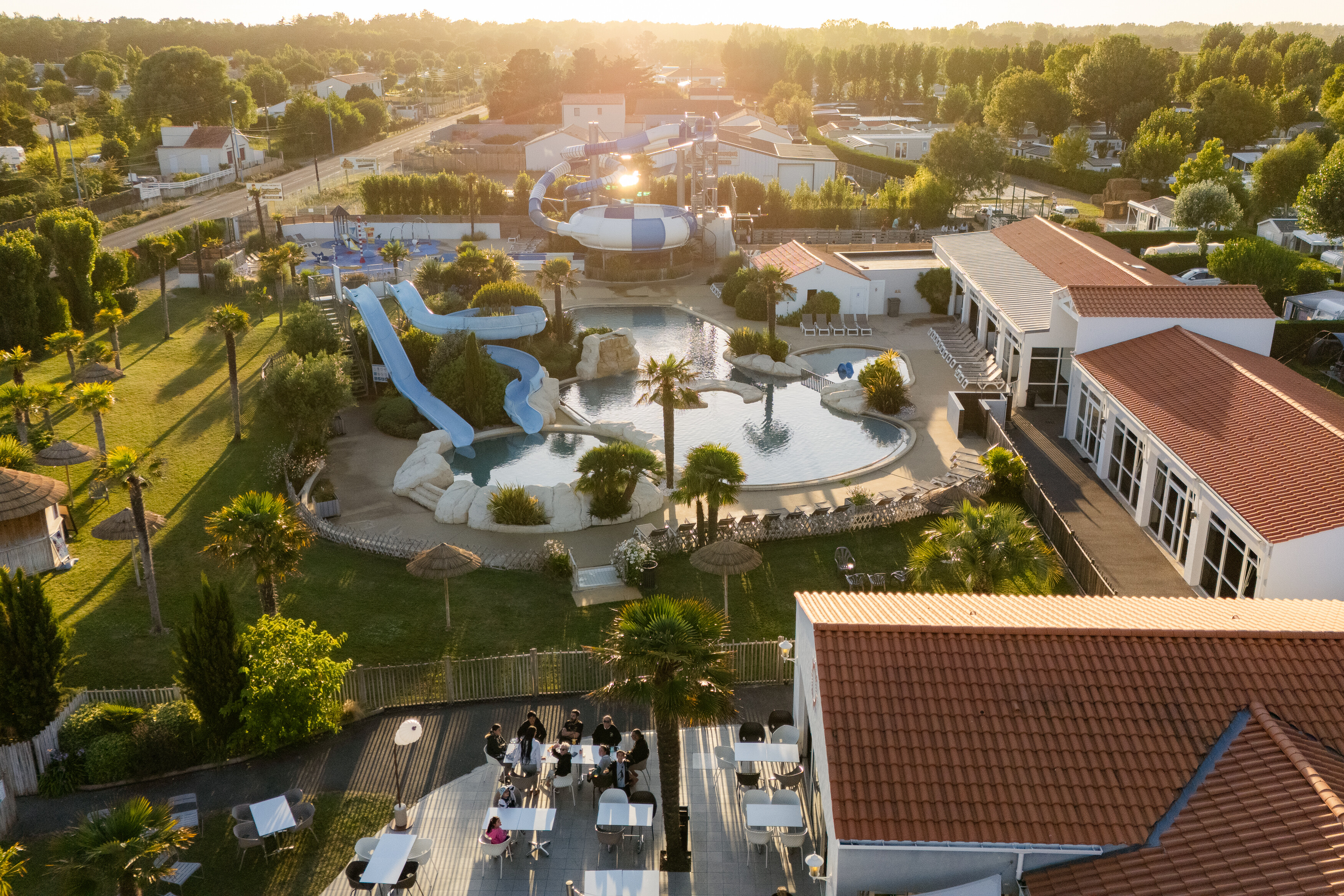 - Binnen- en buitenzwembaden met glijbanen en peuterbad